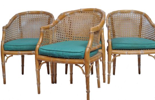 Manner Of Giorgetti - A set of four retro vintage 20th century circa 1970s bamboo salon chairs / easy chair. The chairs having a horseshoe backrest with cane upholstery, padded seats raised on natural legs. Measures approx. 86 cm high x 57 cm wide x 52 cm deep.