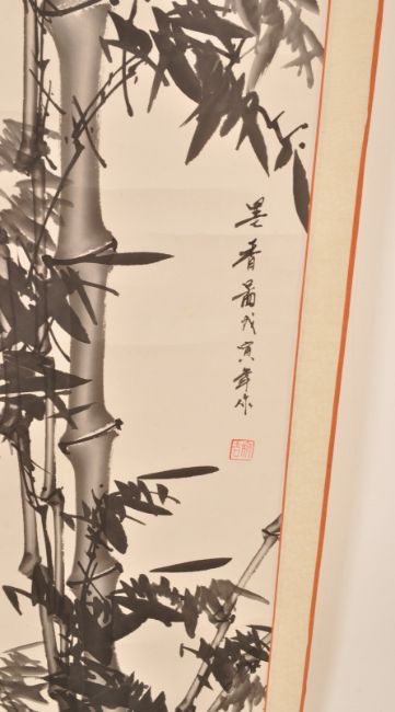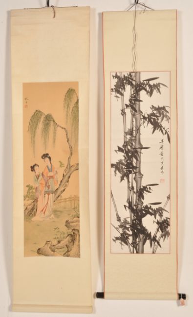 Two vintage 20th century Oriental Chinese scrolls one having countryside scenes together with a monochrome bamboo picture. Measures approx. 164cm x 42cm.