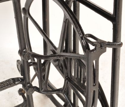 An original upcycled vintage retro mid upcycled 20th century wooden butchers block of a rectangular form raised on a vintage retro early 20th century circa 1930's cast iron sewing machine base by Nova. Measures 88cm high x 92cm wide x 61cm depth.
