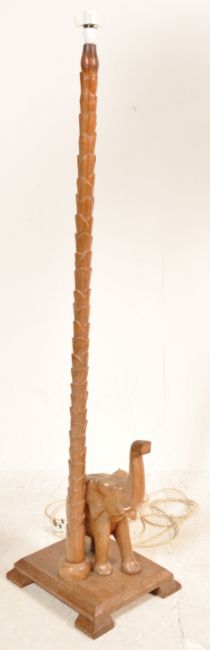 A vintage retro 20th century 1970s hardwood carved floor standard lamp. The lamp having a carved palm tree effect column with elephant figurine to the base raised on square base.