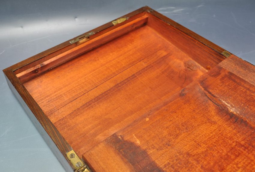 A 19th century Victorian oak writing slope having an inlaid lid opening to reveal a fully appointed interior together with another box. Measures 16cm x 33cm x 23cm