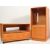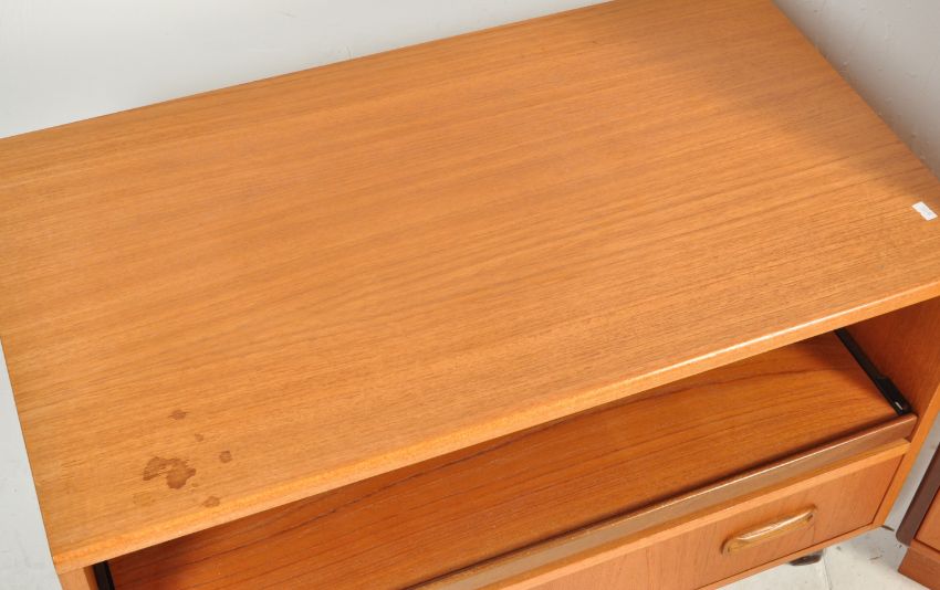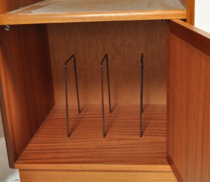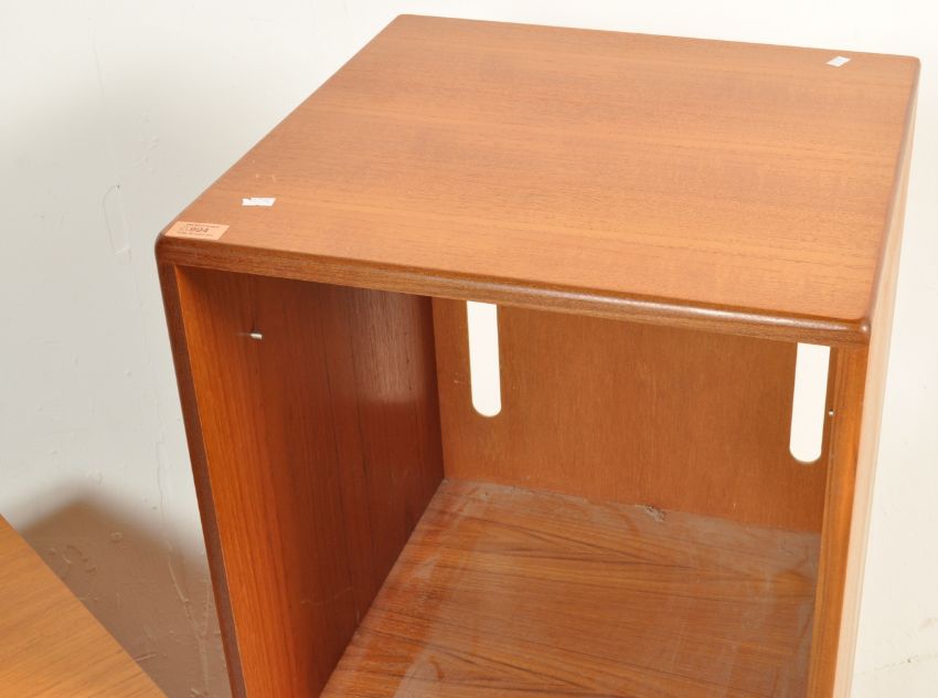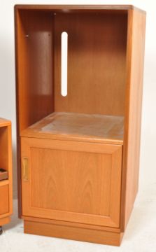Two retro vintage 20th century circa 1970s teak units comprising of an upright record cabinet having a single door cupboard opening to reveal a sectioned interior raised on a recessed base together with a TV stand having a single drawer below raised on wheels.