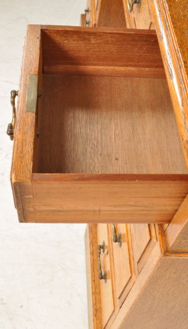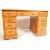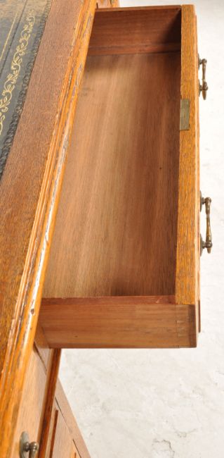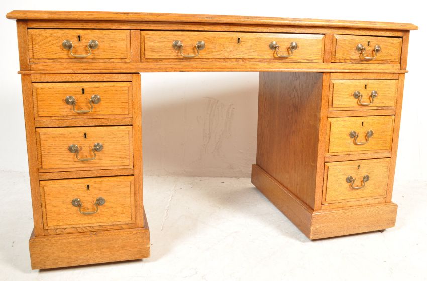 An early 20th century oak pedestal writing desk having a gilt tooled leather writing skiver over two pedestals with brass swan neck handles raised on plinth bases. Measures 75cm high x 120cm wide x 59cm depth.