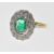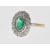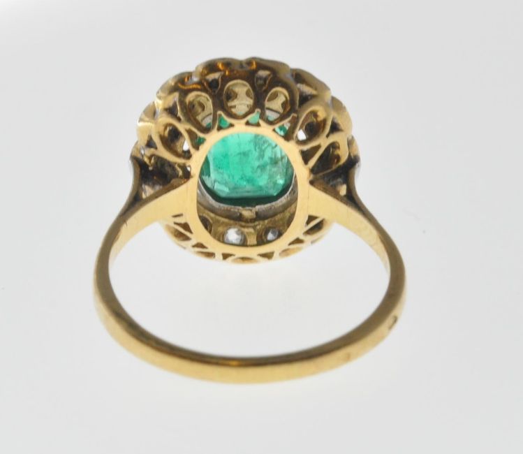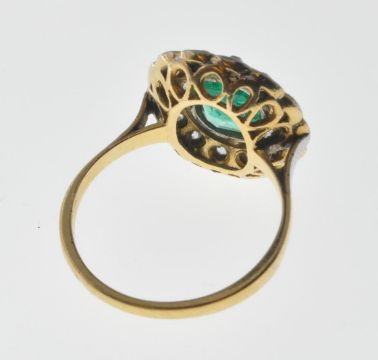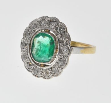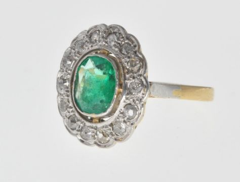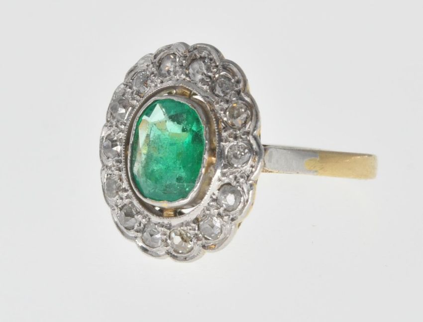 A late 19th / early 20th Century antique French emerald and diamond ring set with a central faceted oval cut emerald with a halo of fourteen round cut diamonds in a white metal head. Eagle assay mark to verso of the band. Weight 3.7g. Size J. Emerald measures 7 x 6 mm approx.