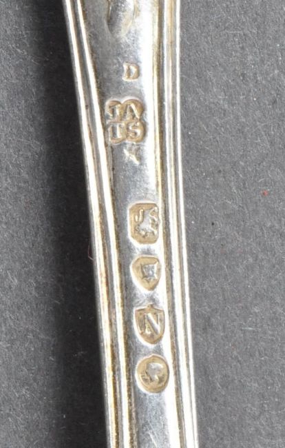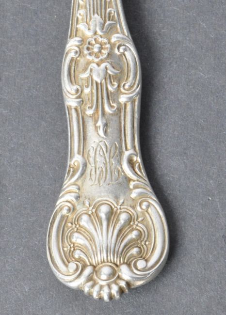 A Victorian 19th century hallmarked silver cutlery flatware set to consist of three dinner forks, three dessert forks, two serving spoons and two dinner spoons. Most having initials engraved to the terminals and foliate palmette motifs to the stem and handle. Hallmarked for London, London Georgian John Aldwinckle and Thomas Slate, 1888. Measures 21cm in length. Total weight 805g.