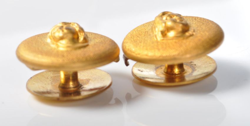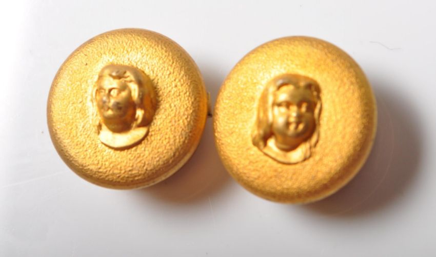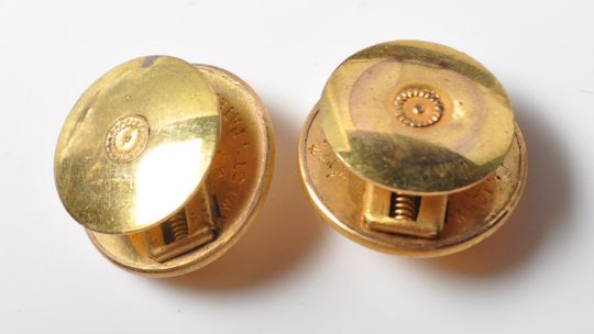 A pair of 20th Century antique gold plated cherub studs / buttons of round form having raised cherub faces to the centre of each with spring action removable backs in original leather presentation box (marked T&S West Patent, measures approx 2cm diameter) together with a Victorian glass and copper lidded perfume scent bottle (measures 6cm tall).