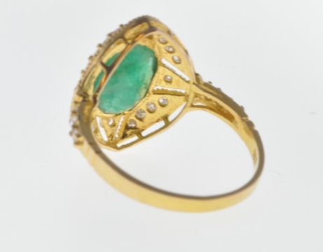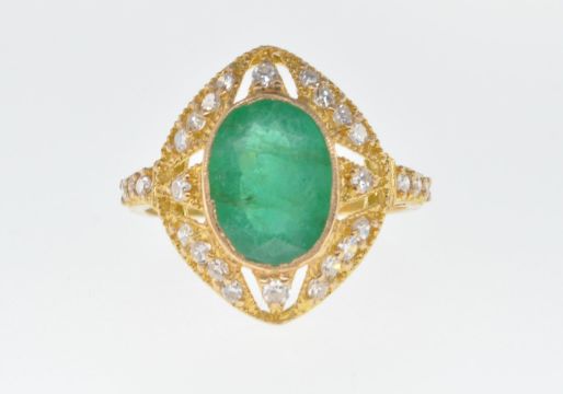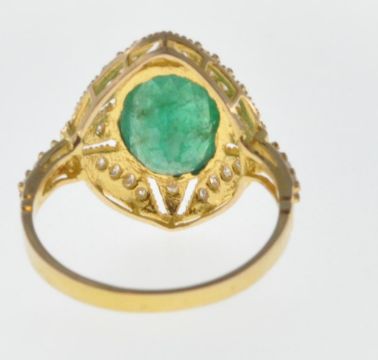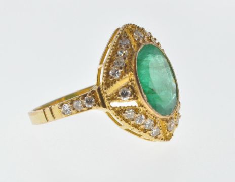 An 18ct gold emerald and diamond dress ring being set with an oval cut emerald bezel set in a pierced mount with twenty-six round cut diamonds set throughout. Emerald measures approx 11mm. Weight 3.8g. Size Q. Marked 18k to in inside of the band.