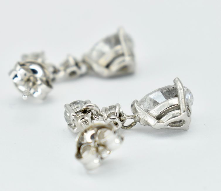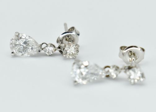 A pair of 18ct white gold and diamond pendant earrings. The earrings strung with pear brilliant cut diamonds surmounted by 2 round brilliant cut diamonds to post backs. Estimated diamond weight pear - 1ct each. Estimated total weight 2.4ct. Actual total weight 1.3g\