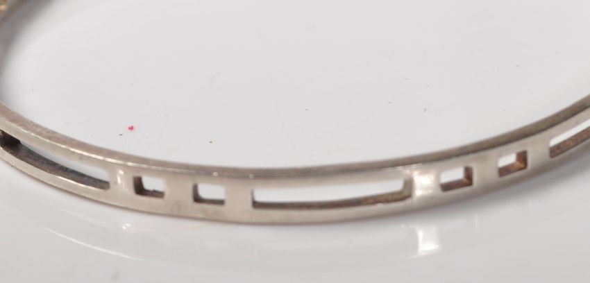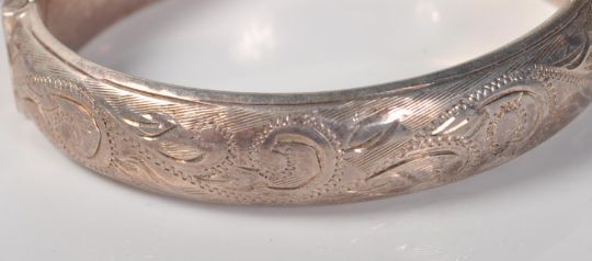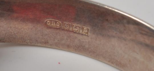 A collection of stamped 925 and hallmarked silver bracelets to include an Indian cuff bracelet with bezel set red stone, an engraved silver bangle hallmarked for Birmingham 1964, a bangle bracelet with pierced square design and two others. Total weight 99.59g.