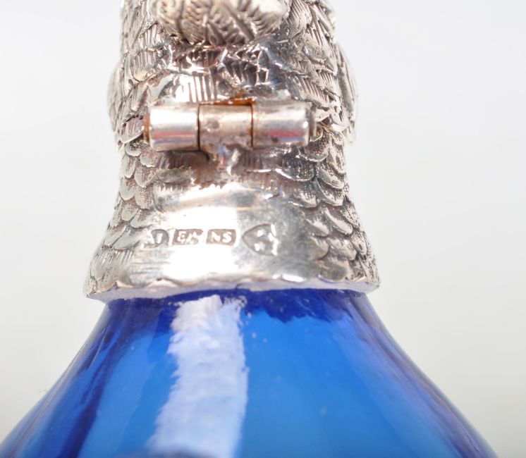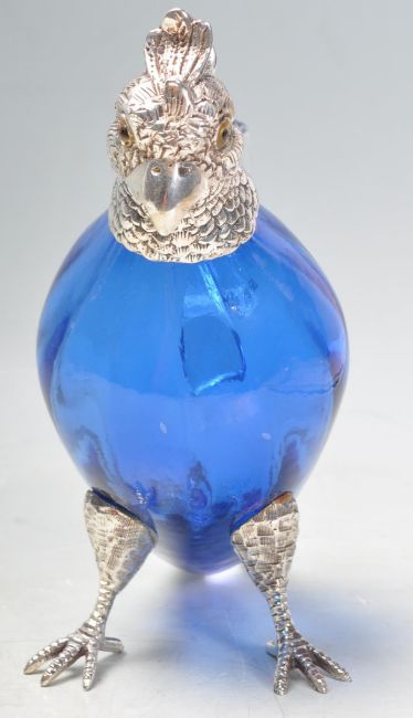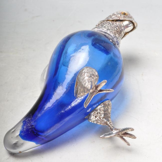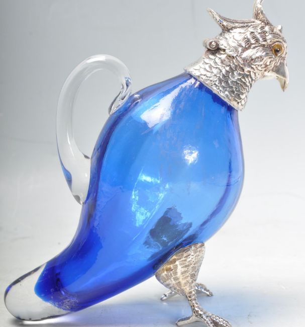 A blue glass and silver plate claret jug in the form of a parrot / bird of paradise, having a hinge at the head, engraved features and glass eyes. Stamped to the neck. Measures 16cm tall.