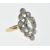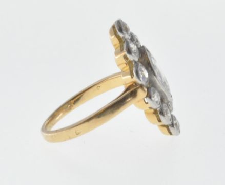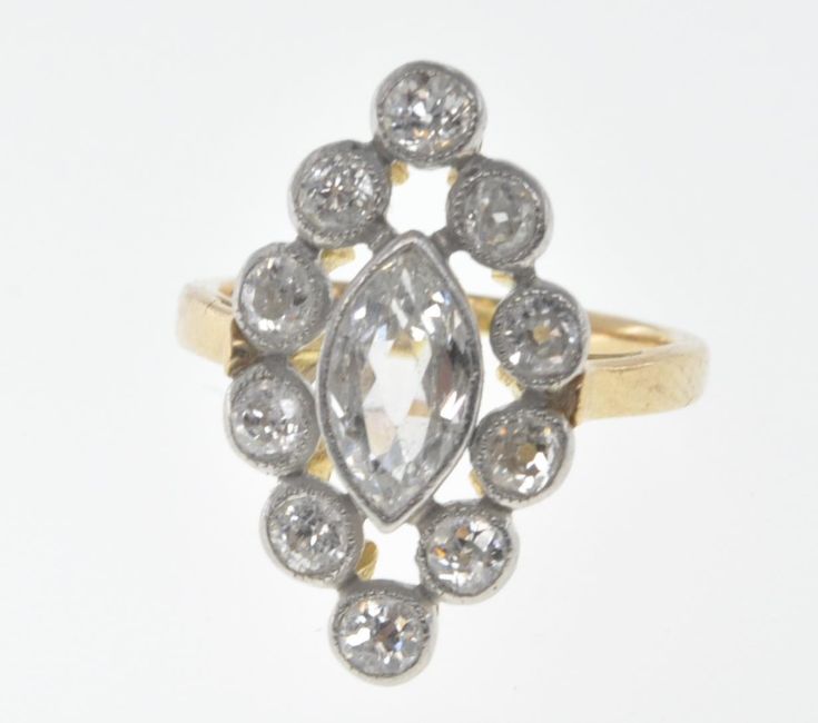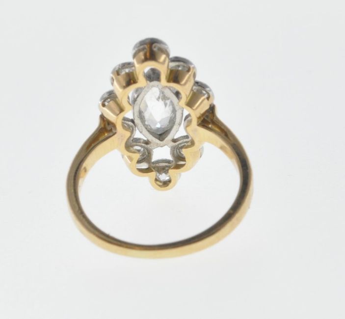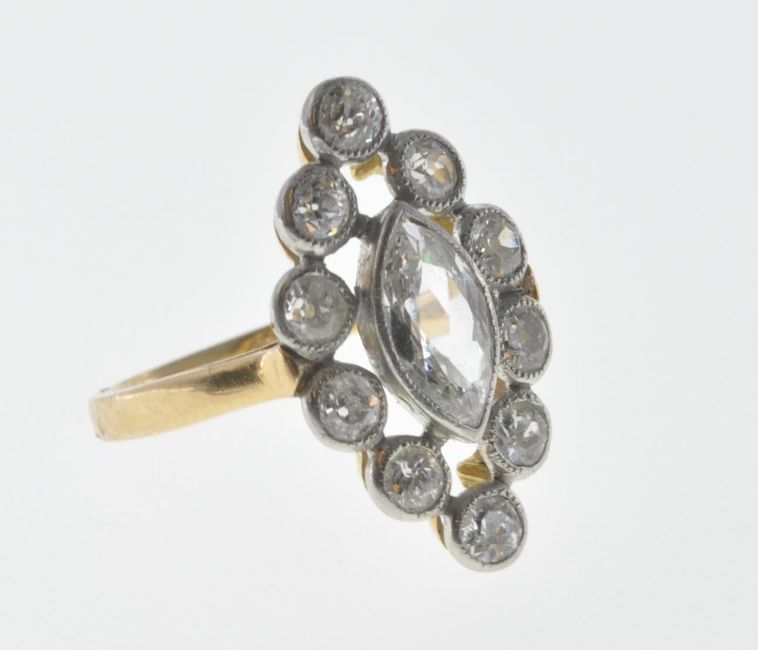A French 18ct gold and diamond ring set with a central marquise cut diamond having a halo of round cut diamonds in millegrain settings. French eagle mark to the back of the band. Weight 3.8g. Size I. Diamonds estimated 1.2ct. Head measures approx 2cm.