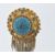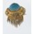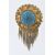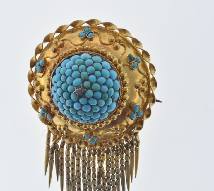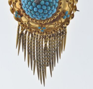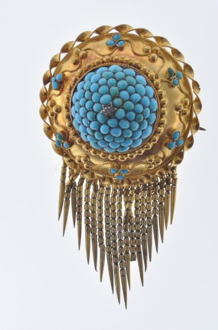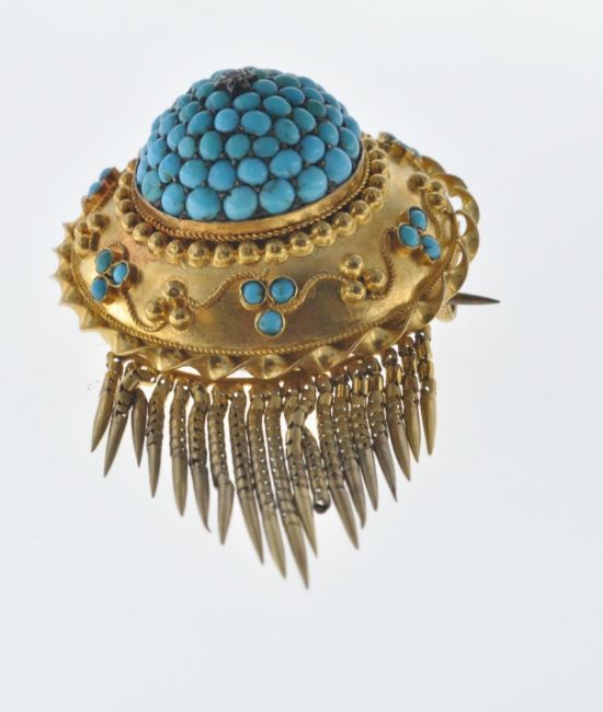 A 19th Century Victorian yellow metal brooch of round form having a central dome set with turquoise cabochons with a diamond to the centre, the mount having wire work details, further turquoise stones with twisted borders and fringe to the bottom. Unmarked. Measures 13.5cm diameter.