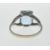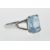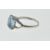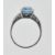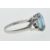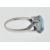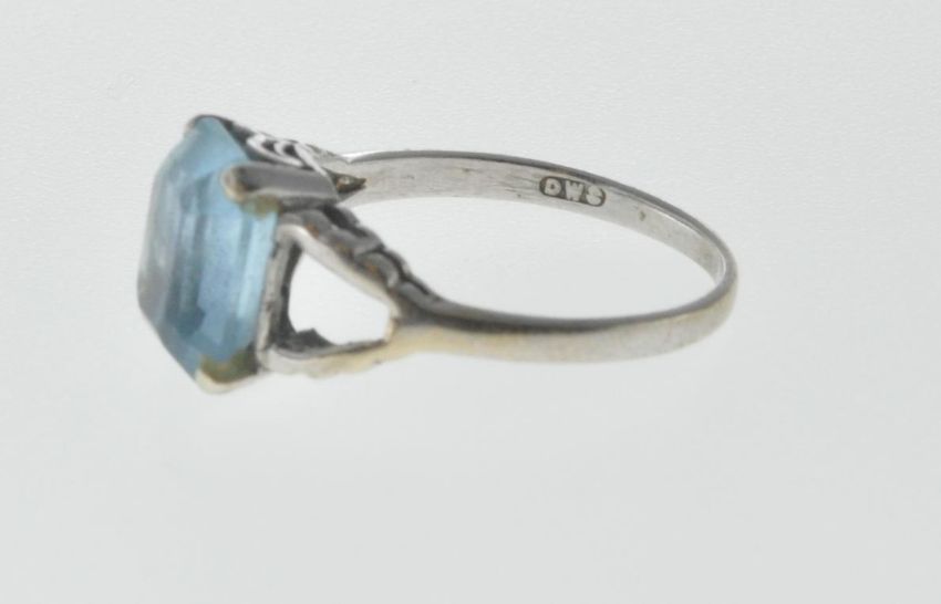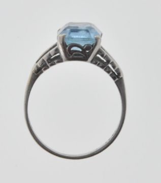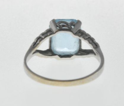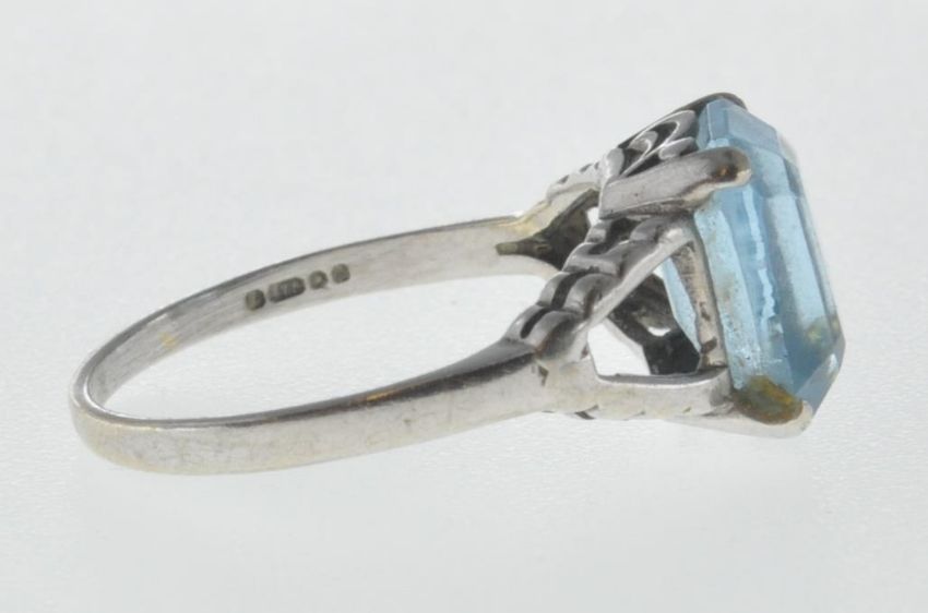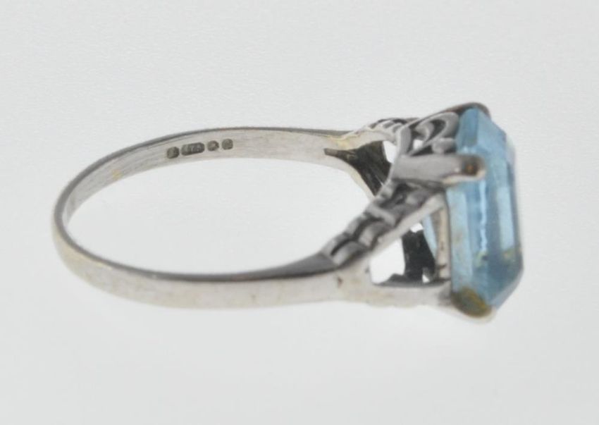 A stamped 9ct white gold ring having a central emerald cut blue stone within a claw setting upon pierced cathedral shoulders. Stamped 375. Hallmarked for London. Ring size L.5. Total weight 2.5g.