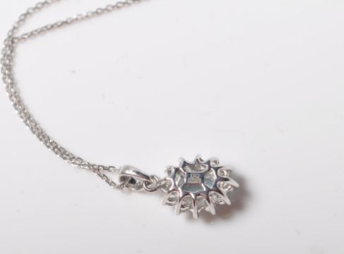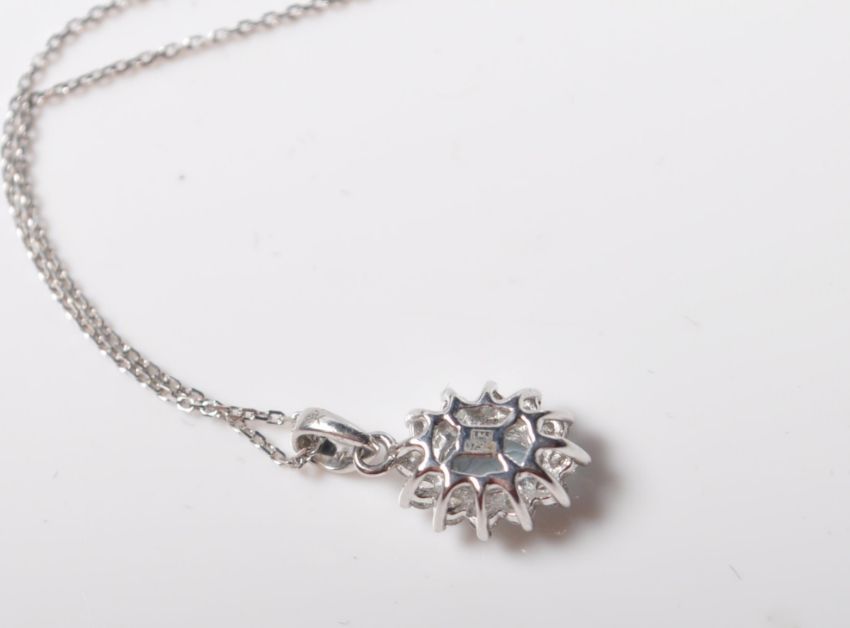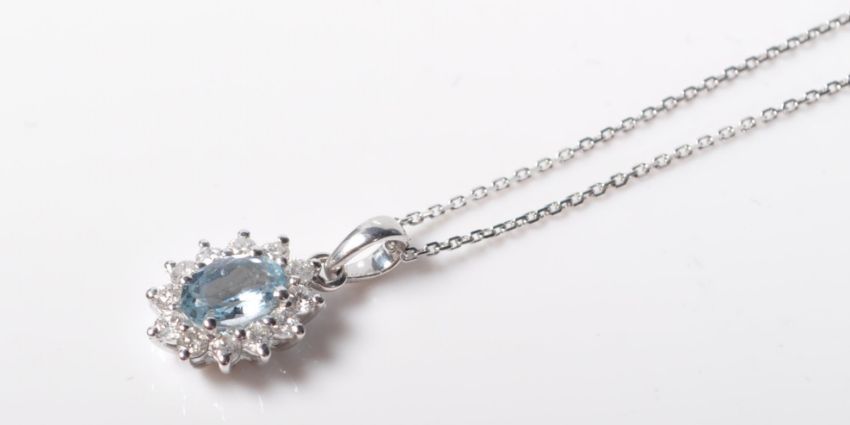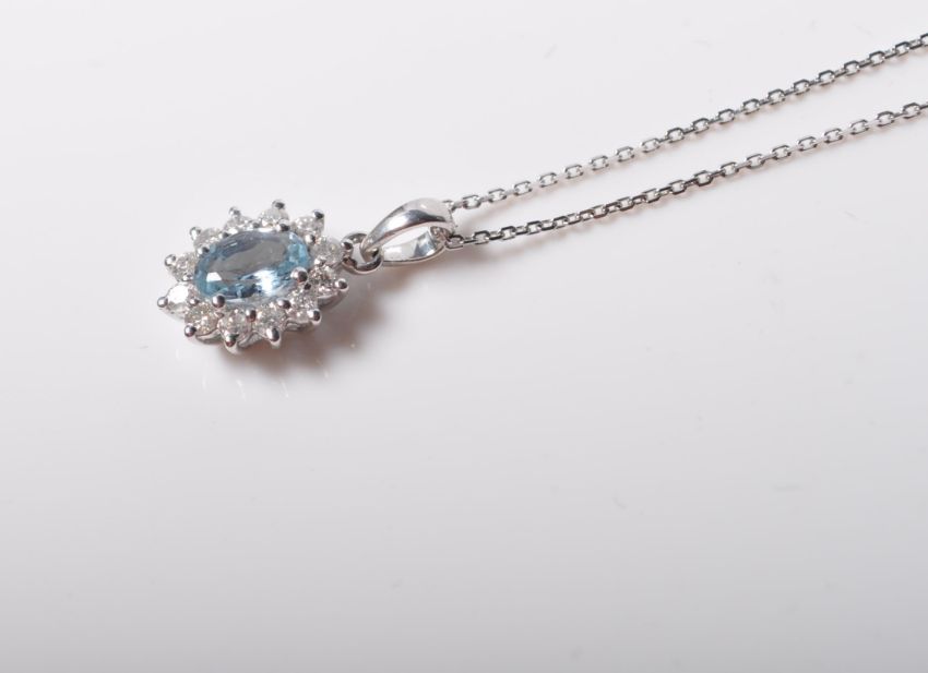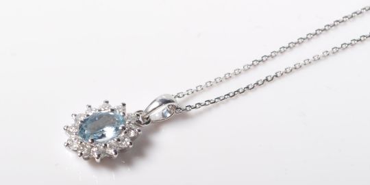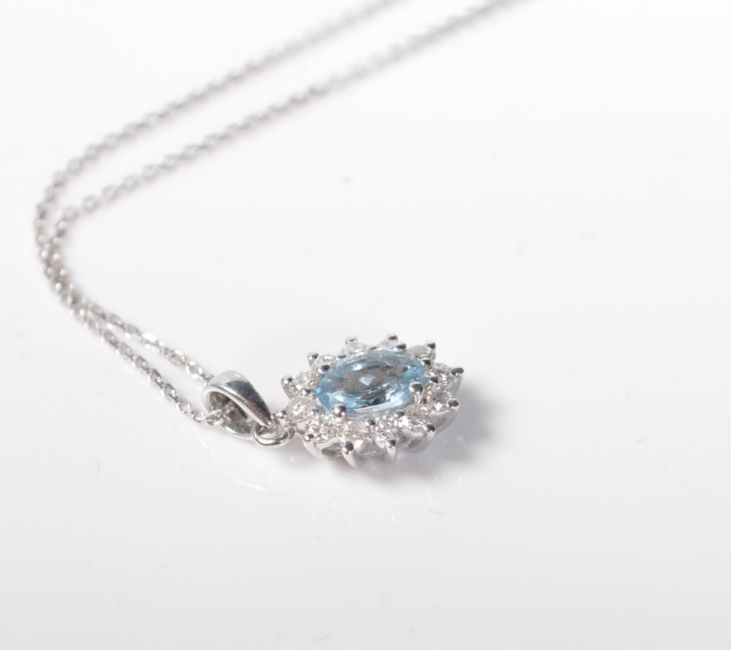 A 9ct white gold pendant necklace having a central oval cut aquamarine surrounded by a halo of diamonds. Diamonds having and estimated total of 24 points.The aquamarine measuring 6mm x 4mm. Stamped 375 to the back of the setting and the chain clasp. Chain measures 40cm in length. Total weight 1.6g.