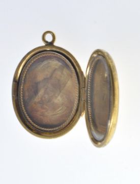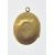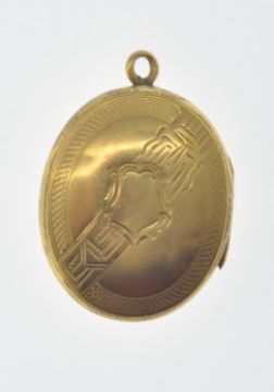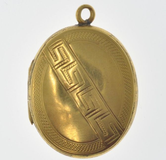A 19th Century Victorian antique gold plated locket of oval form having engraved greek key decoration with an unmarked armorial crest to the front, with two glazed panels to the interior and bale to the top. Measures 3cm.