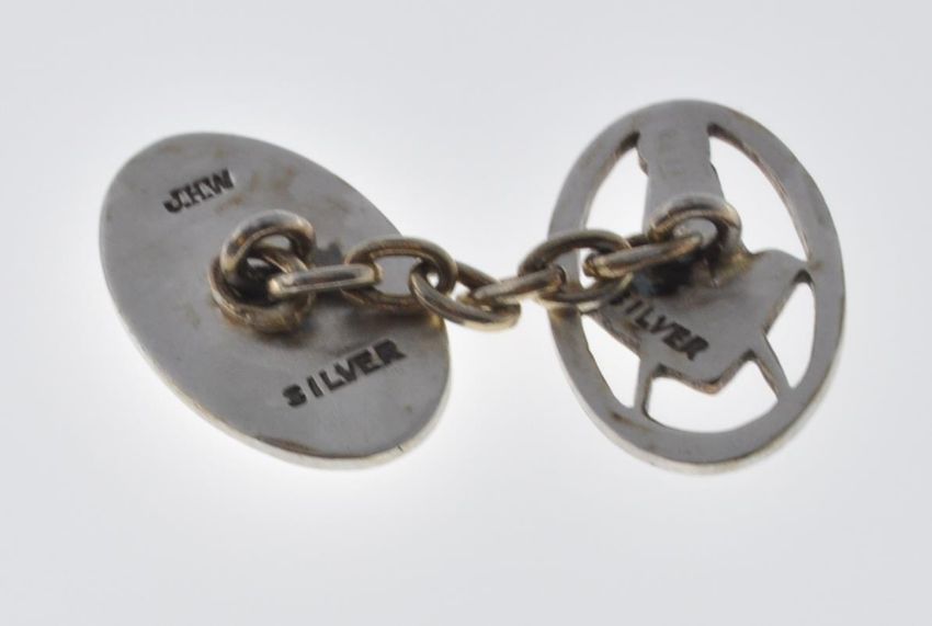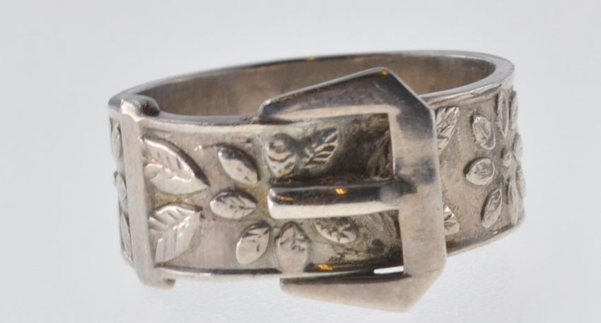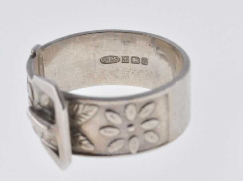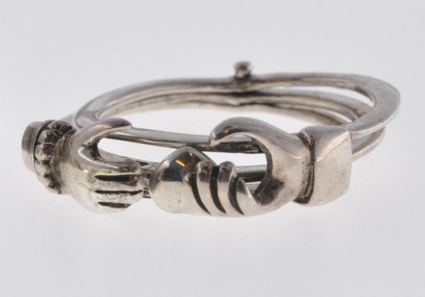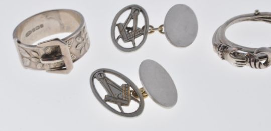 A group of 20th Century silver jewellery to include a Victorian antique style buckle ring with moulded floral decoration (hallmarked Birmingham 1977, size T.5),  three piece silver gimmel ring in the form of two hands clutching a heart (marked 925, size P) and a pair of silver cufflinks with pierced masonic symbols (marked silver). Total weight 15.8g.
