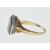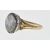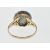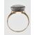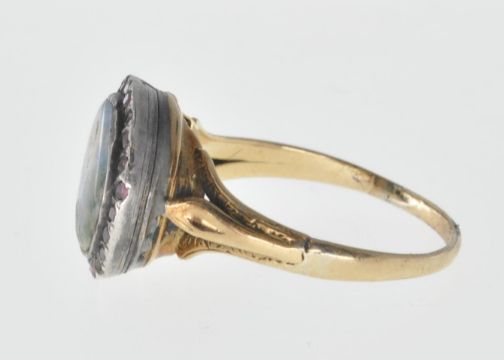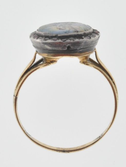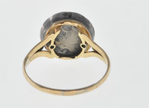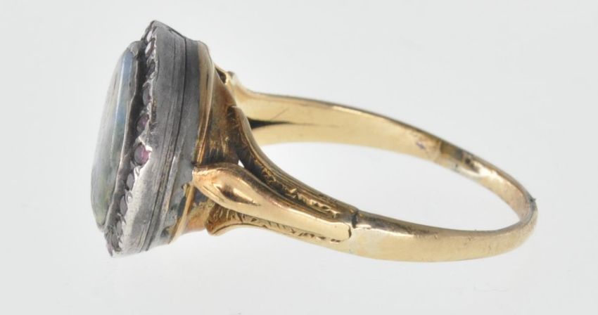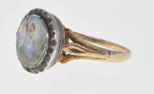An antique gold ring set with a round ceramic panel being hand painted with a female figure within a lake scene having a halo of round cut garnets set to the head with engraved decoration to the shoulders. Some restoration to the panel, three stones missing. Weight 4.7g. Size Q.