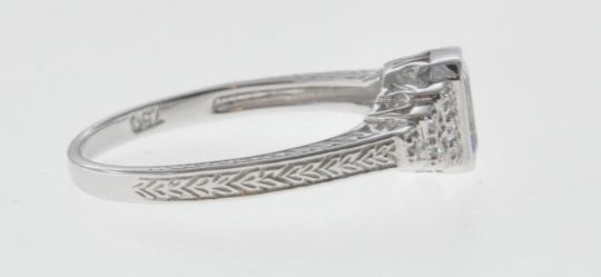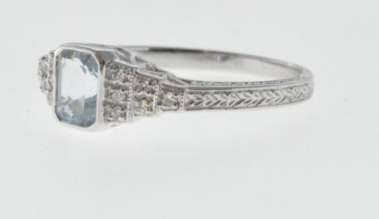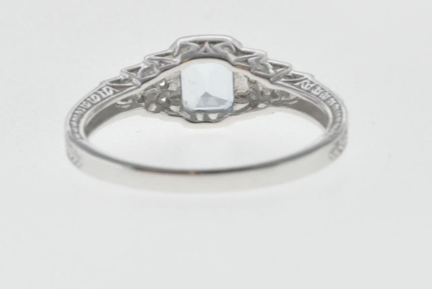 An 18ct white gold aquamarine and diamond ring having a rectangular cut aquamarine to the centre having stepped shoulders set with diamond accent stones. Weight 2.8g. Size N. marked 750.