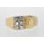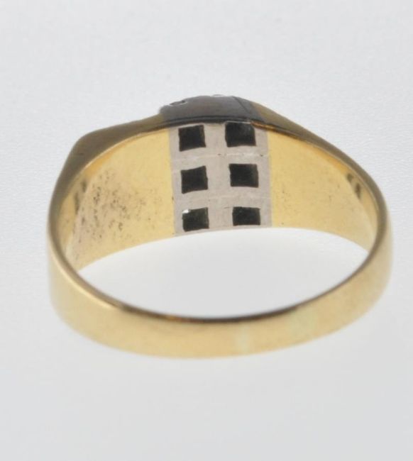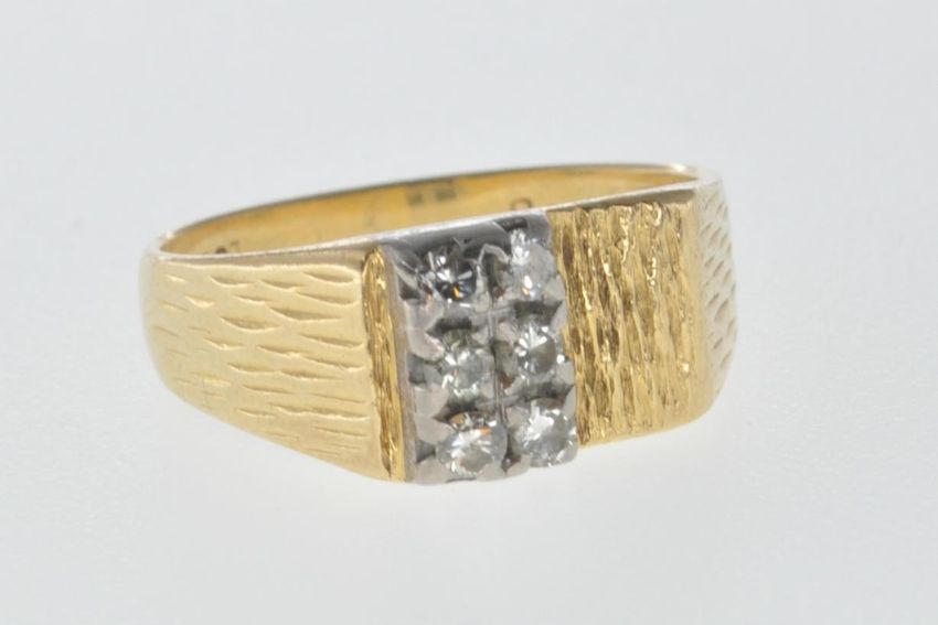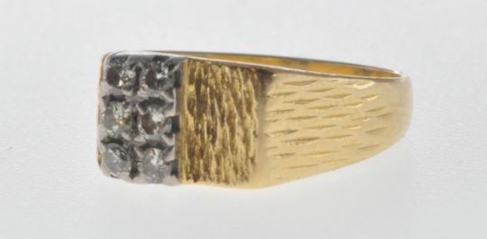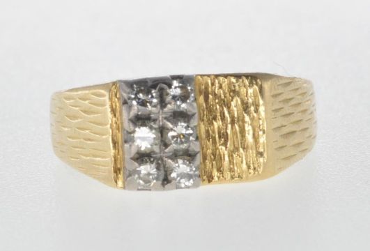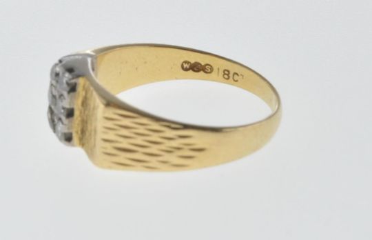 A stamped 18ct gold ring having two rows of diamonds within claw settings and bark effect to the shoulders. Size P. Total weight 6.2g.