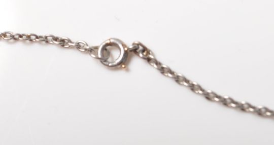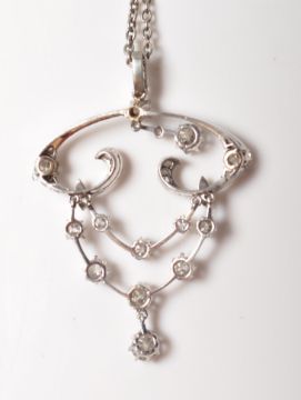 An early 20th Century Art Nouveau pendant necklace, the pendant in the form of a stylised scroll set with thirteen old  cut diamonds with further accent stones to the knot and bale, mounted to a chain necklace. Largest diamond measures approx 4mm diameter. Pendant measures approx 4.5cm including bale. Weight 11.1g.