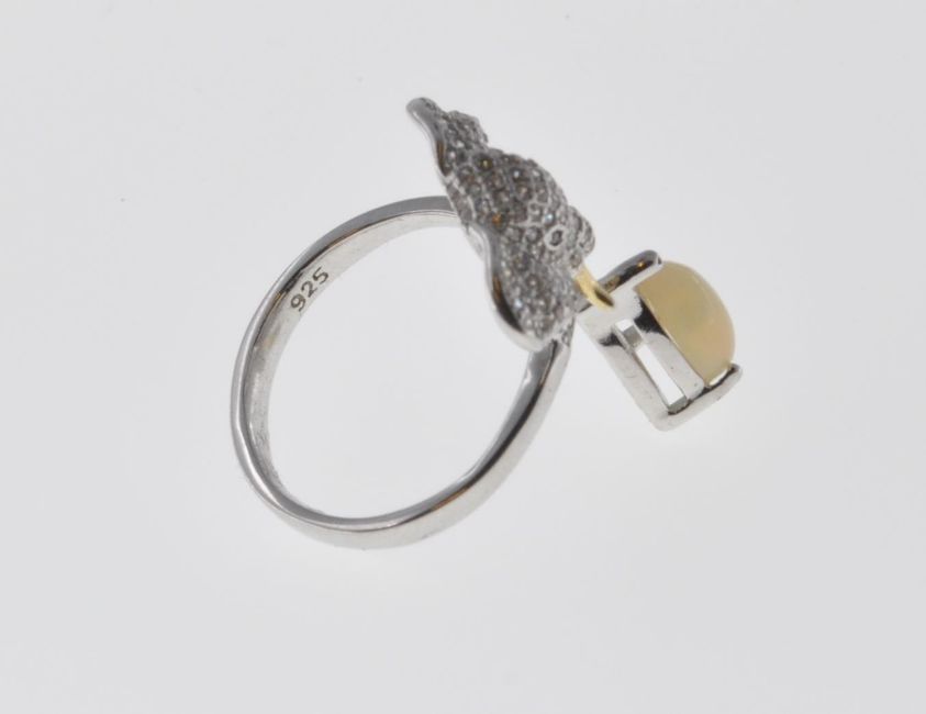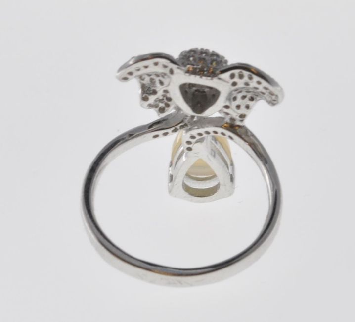 A stamped 925 silver ladies dress ring having an elephant to the top set with CZ's and an opaque stone within a claw setting below. Ring size R. Total weight 5.4g.
