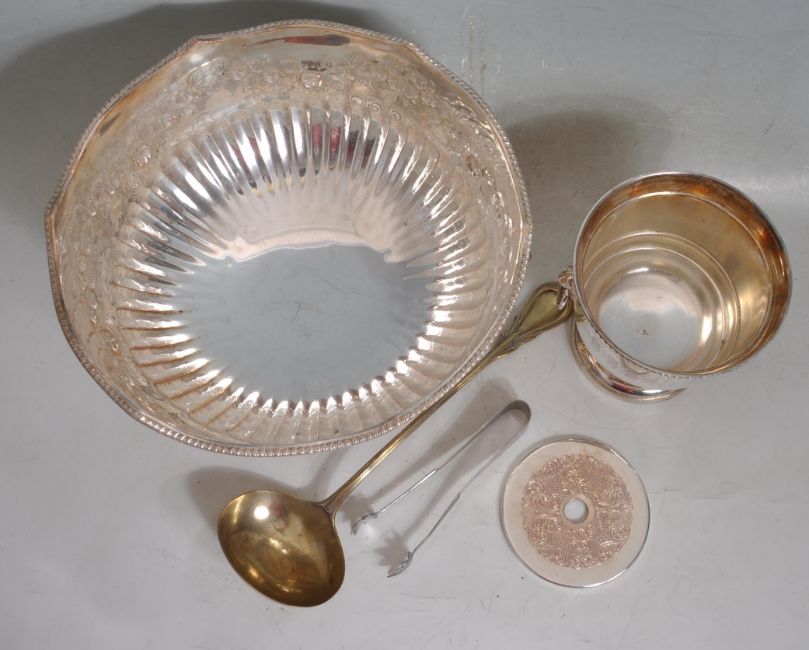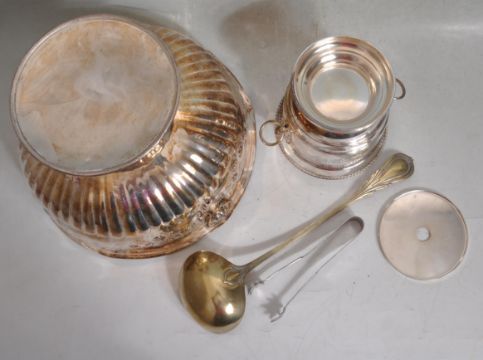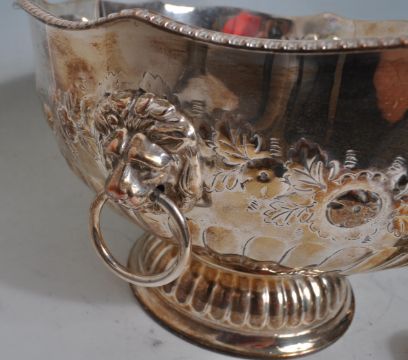 A vintage 20th century silver plate punch bowl having beaded edges with a scalloped edge, over foliate decoration raised on a circular gadrooned base. Stamped silver on copper to the base. Together with a silver plate hand engraved silver plate champagne bucket with lions head carry handles to each side.