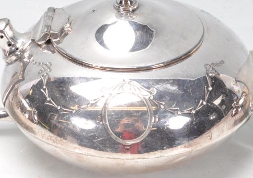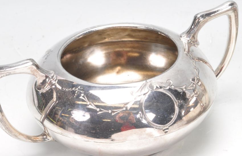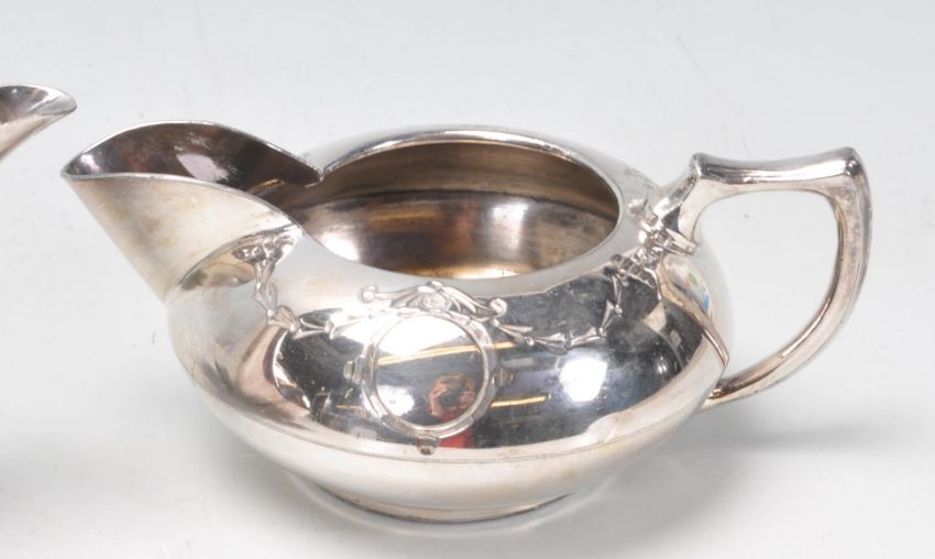 An early 20th century English silver plated three piece tea service. The service comprising of a tea pot, milk / creamer jug and sugar bowl. All having foliate motifs engraved to the body.