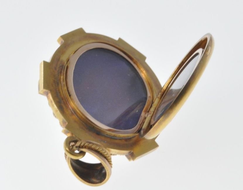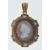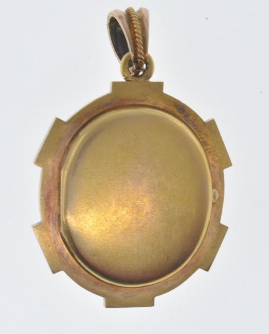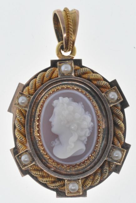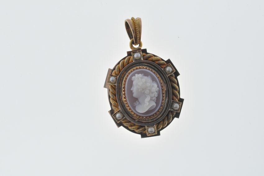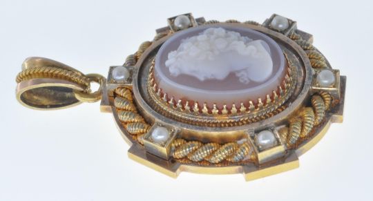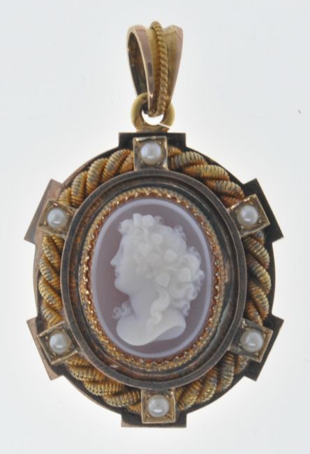 A 19th Century Victorian yellow metal pendant locket set with a central carved agate cameo featuring a female figure facing left set within rope twist borders and set with six half pearls. The locket opens to reveal two windows with glazed panels and having a rope twist bale to the top. Measures approx 5cm including bale.