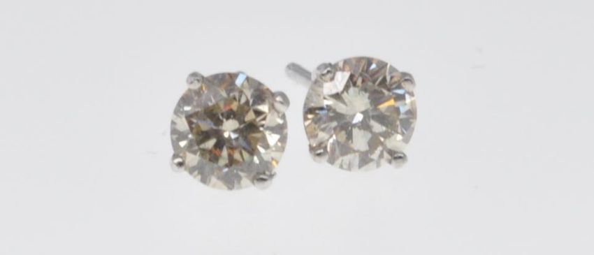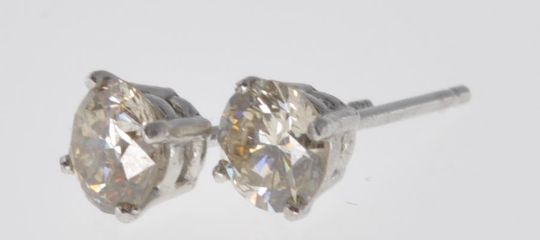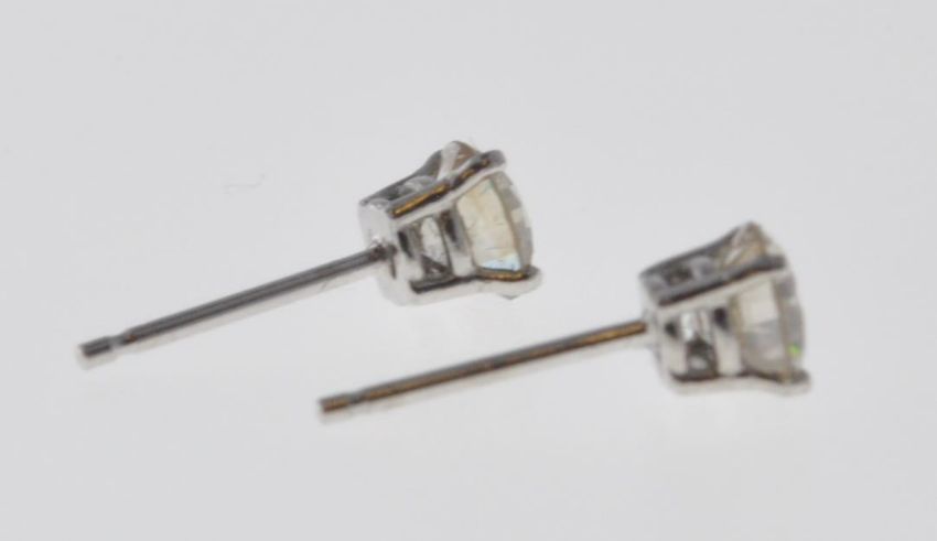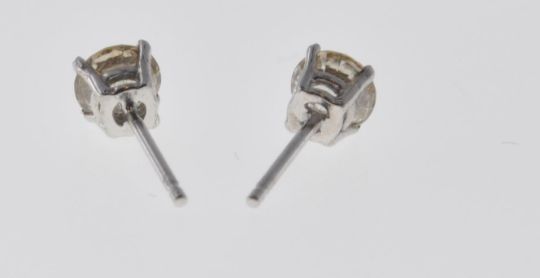 A pair of 14ct white gold and diamond earrings having two round cut diamonds of an estimated 70 points total. Tests indicate 14ct, posts are unmarked. The backs are replacements, one being stamped 925. Total weight 0.8g.