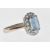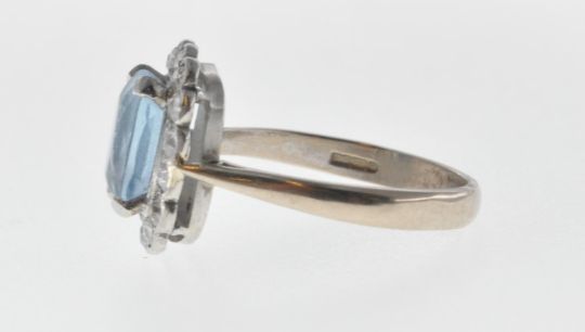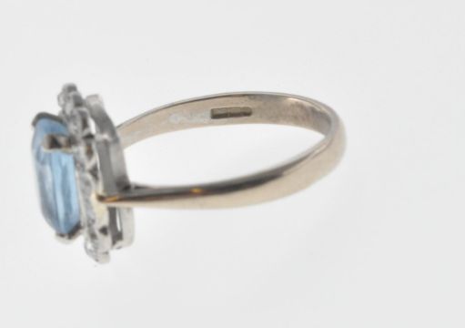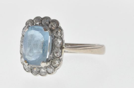 A vintage 18ct white gold ring set with a cushion cut aquamarine with a halo of round cut diamonds. Interior of the band marked 750. Weight 4.6g. Size P.5. Aquamarine measures 9mm.