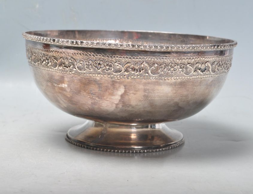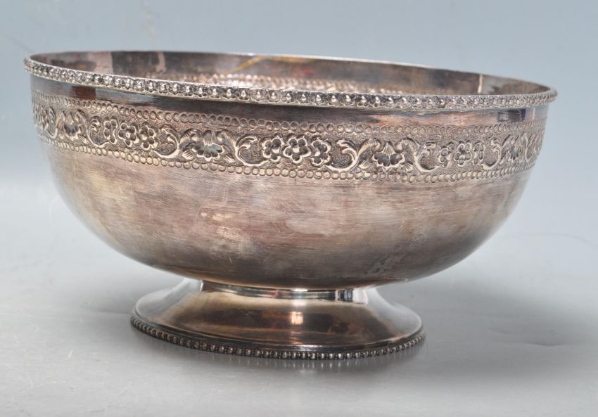 A contemporary silver footed centre piece bowl having moulded floral borders and raised on a round foot with moulded details. Marked silver to the base. Weight 477g. Measures 20.5cm wide.