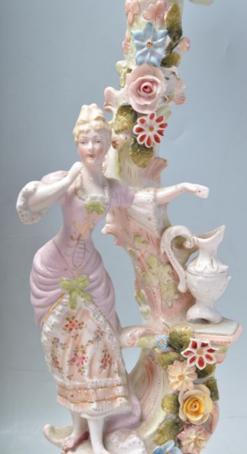 A 19th century Victorian French reproduction three piece garniture mantle clock and candlestick set. The clock having a maiden feeding a lamb atop and putti and flowers surrounding the clock face. The candelabra featuring a courting scene and flowers all over. All three pieces being hand painted in pastel colours. Condition: several repairs and breaks to the china. Measures 47cm tall.
