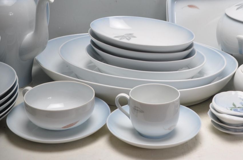 A large and extensive vintage retro 20th century six person ceramic porcelain dinner service made in Denmark by Kjobenhavn. The service comprising of a various selection of dining plates of various sizes, cups, saucers, side plates, coffee cups, teapot, tureen, oval dishes, and many more. All decorated with floral motifs on a light purple background. Makers mark to the underside.