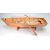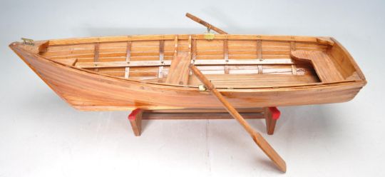 A vintage 20th century scratch built model rowing boat having hand made oars, crutch and frame. Raised on a stand. Measures 14cm x 64cm x 23cm.