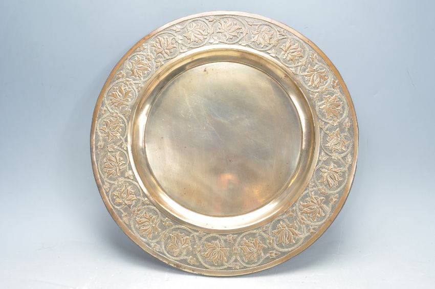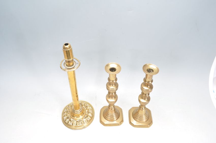 A collection of 20th century brass items to include a large tavern tray with dragon and mask border, a French armorial double handles tray, candlesticks and more. Measures 63cm x 49cm.