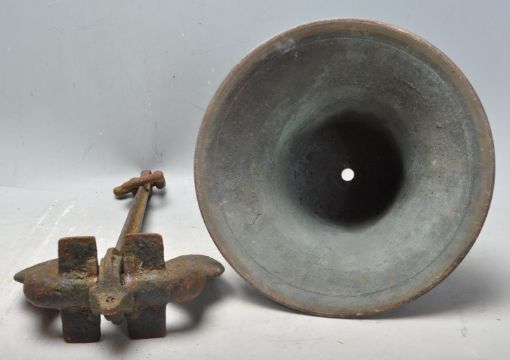 An early 20th century Navy ships brass bell of a typical form along with a small cast metal / iron anchor. Measures 21cm tall.
