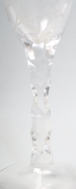 An early 20th century sherry glass having an etched crane and plant to the body and a cut glass stem. Measures 14cm tall.