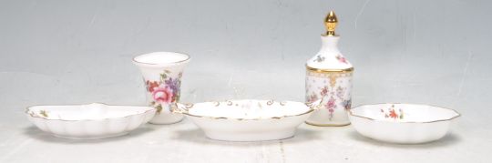 A group of five Royal Crown Derby 'Derby Posies' pattern ceramics to include three trinket dishes, a small bottle and stopper and a miniature vase. All having a white ground with painted florals. Makers and date marks to the bases. Good condition commensurate with age. Bottle measures 11cm tall.