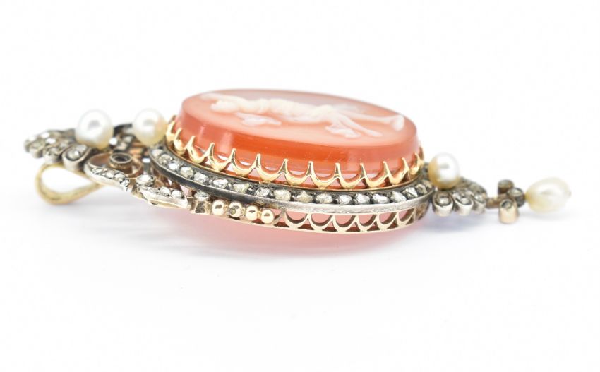 A 19th Century Victorian carved agate cameo pendant having a central cameo with a carved dancer playing a tambourine set within a scrolled mount with diamond and pearl accent stones. Measures 6cm. Weight 13.4g.
