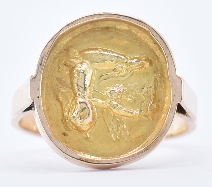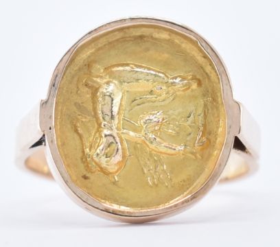 A stamped 14ct gold signet ring having an oval panel to the head depicting a classical scene in relief. Marked K14 to interior of the band. Weight 5.7g. Size U.5.