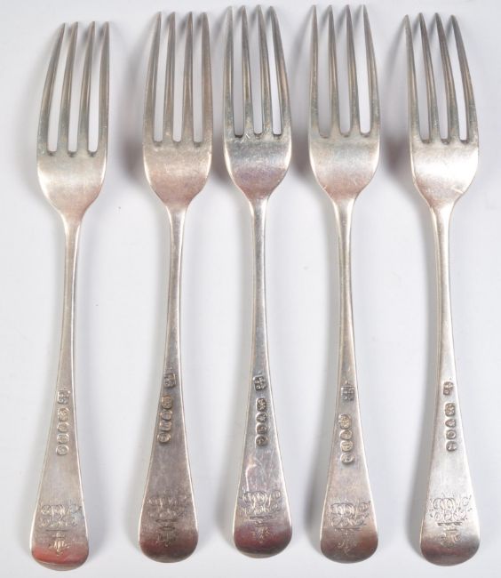 A group of five 19th Century George Smith (III) & William Fearn forks each having engraved initials to the verso of the terminals. Hallmarked London 1829-1831. Measures 19cm. Total weight approx 326g.