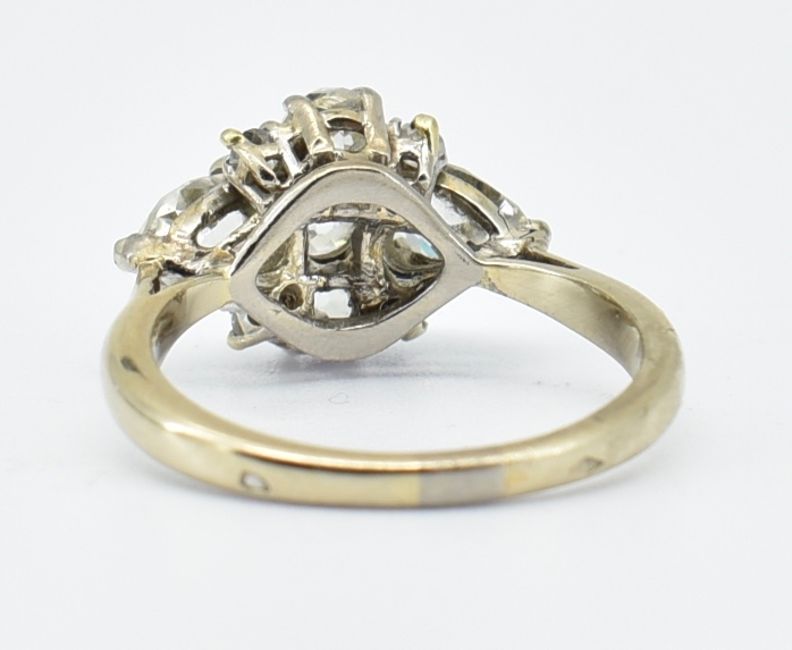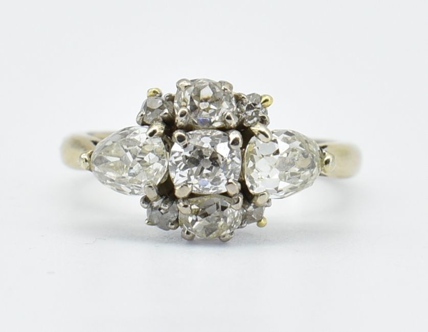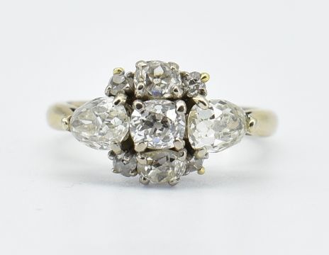 A French 18ct white gold diamond cluster ring set with two old pear cut diamonds and six round old cut diamonds. Pear cut diamond measures approx. 6.2 x 4.3 x 3.mm. Weight 4.3g. Size M.