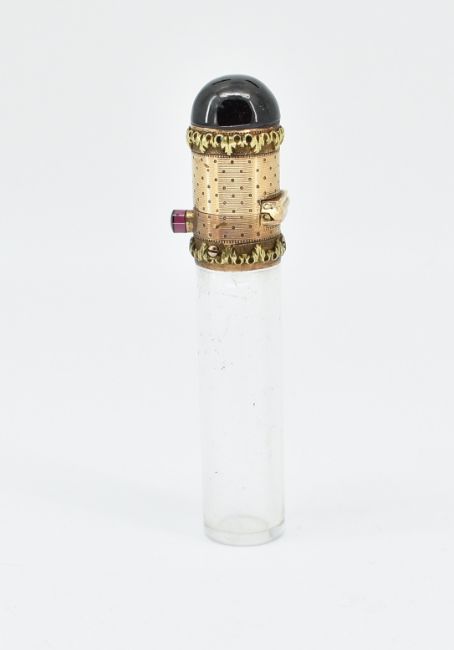A late 19th Century Victorian scent bottle having a glass cylindrical vile with a gold hinged cap to the top set with a garnet cabochon to the top and a further cabochon to the button. Tests indicate gold. Measures 5.6cm high. Weight 14.8g.