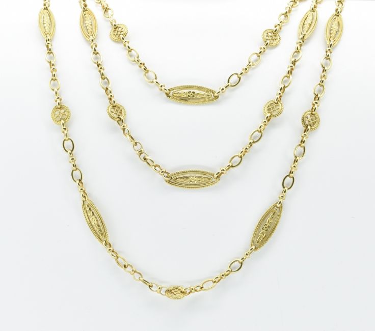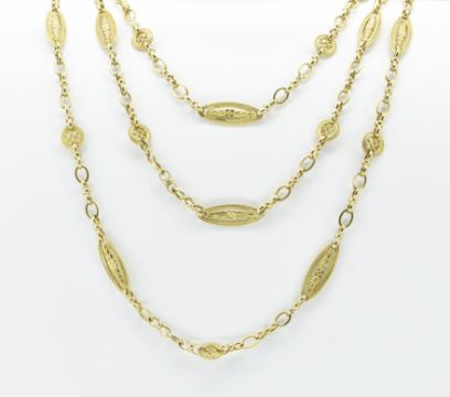A French 18ct gold fancy link necklace chain having decorative lozenge shaped links on a spring ring clasp. French eagle mark to the clasp. Weight 47.1g. Measures 60 inches.