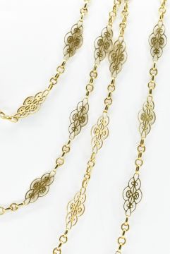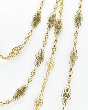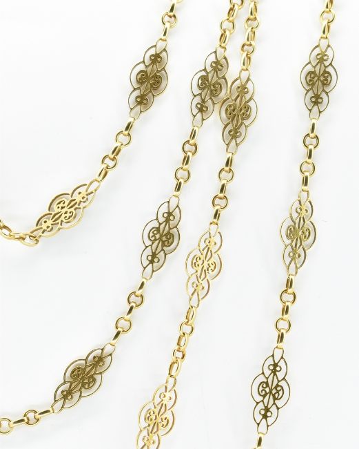 An French 18t gold fancy link necklace chain having pierced scrolled design decorative links. Marked with eagle marks to the jump ring. Weight 32.4g. Measures 154cm.