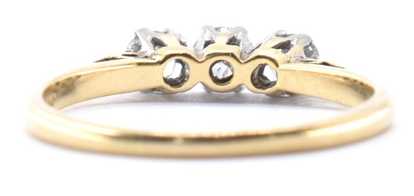 An 18ct gold and diamond three stone ring set with three graduating diamonds in cathedral settings. Marked 18ct. Weight 2.2g. Size O. Total diamonds estimated at 50pts.