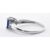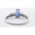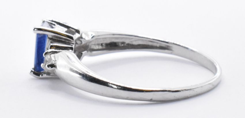 A hallmarked white gold ring being set with a rectangular cut blue stone flanked by two round cut white stones to the shoulders. Hallmarked Birmingham 2006. Weight 2.2g. Size N.5.