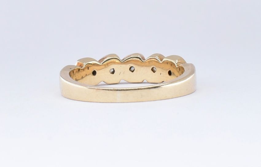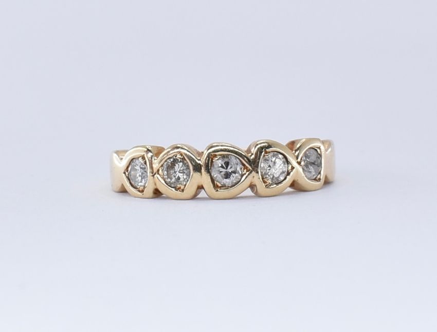 A 14ct gold five stone diamond ring having five round cut diamonds set into triangular shaped settings. Marked 585 to the band. Weight 4.1g. Size M.5. Total diamond weight estimated 0.25 ct.