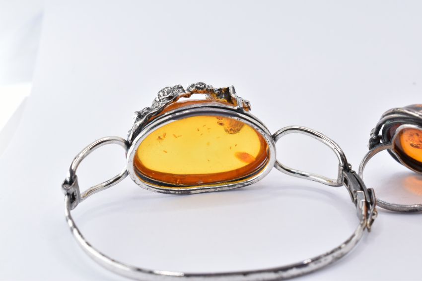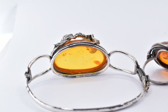 A collection of silver and amber jewellery. The collection including a hinged bangle marked 925. Two rings marked 925.  Two brooches ,one in the form of a spider, marked 925. A pair of stud earrings marked 925.  A pendant marked 925. Rings sizes N & Q.5. Largest cabochon approx 3.8cms.
