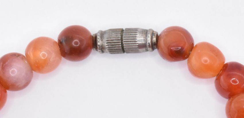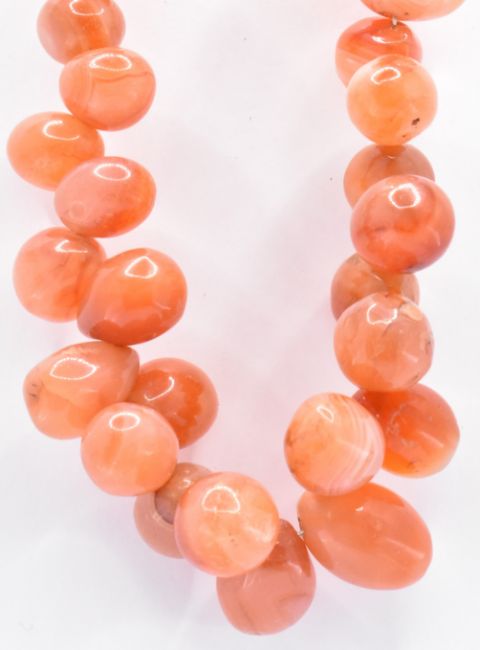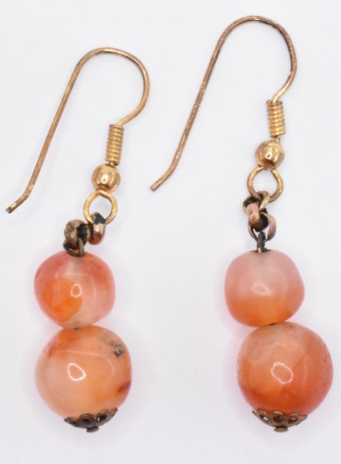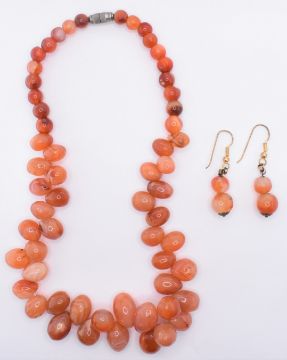 A vintage carnelian strung beaded necklace having threaded round and tear drop shaped beads together with a pair of matching drop earrings. Necklace measures 16.5 inches, earrings measure 2 inches.